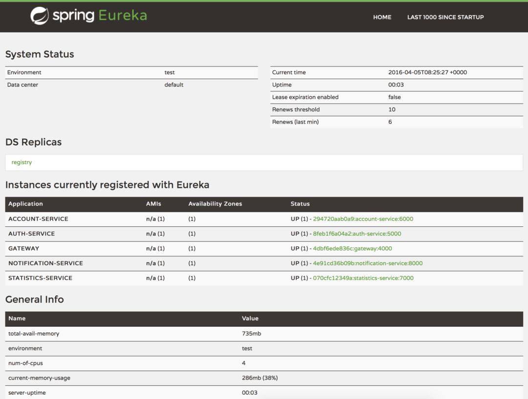 此外,Eureka还提供了一个简单的界面,您可以通过它来跟踪运行中的服务和可用实例的数量:http://localhost:8761