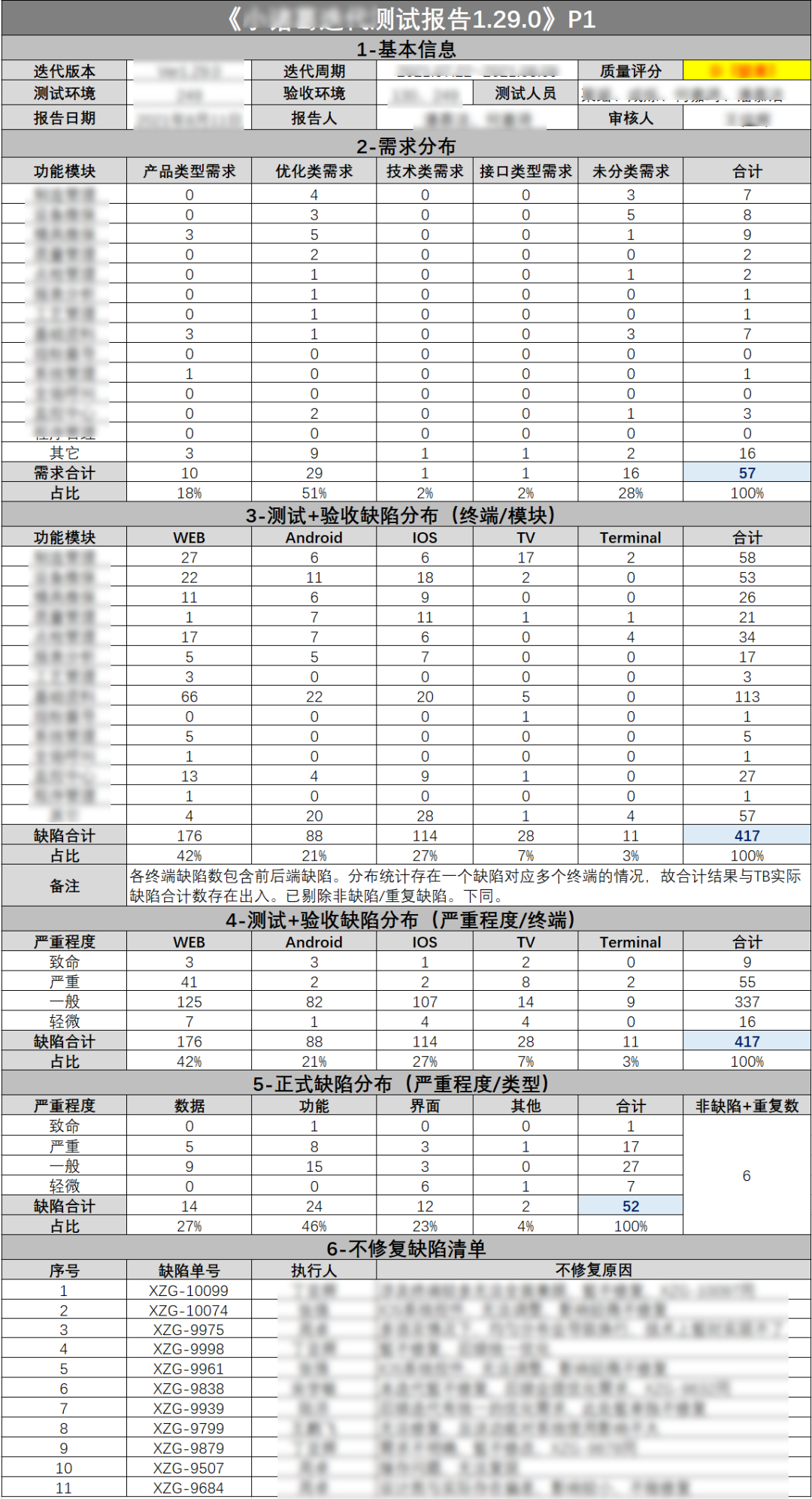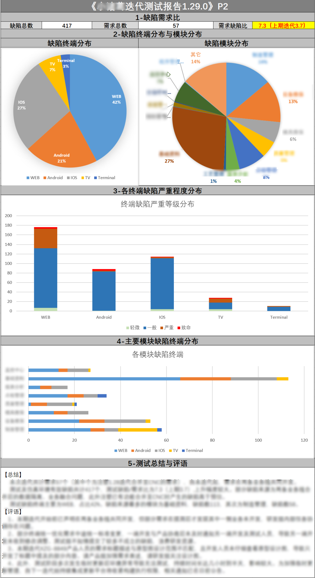 使用excel对需求和缺陷分布进行统计,并生成图形,最后导出PDF进行发布,依赖文件。主要对缺陷的终端分布、严重程度、功能模块进行了统计,暂时未加入缺陷类型(功能、数据、界面等等),还包括不修复清单、总结等信息。