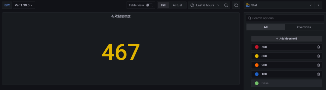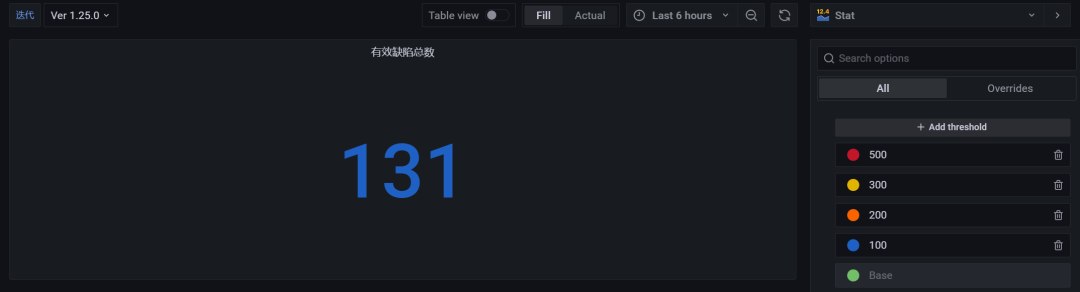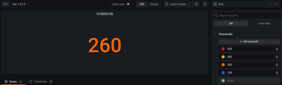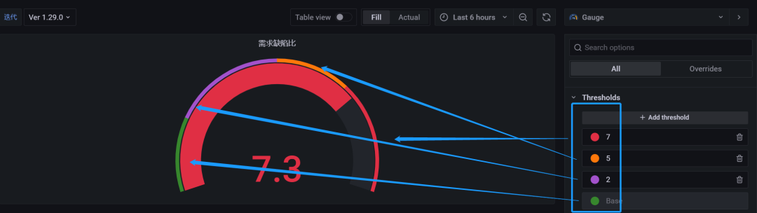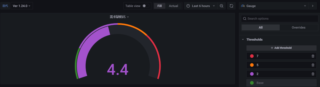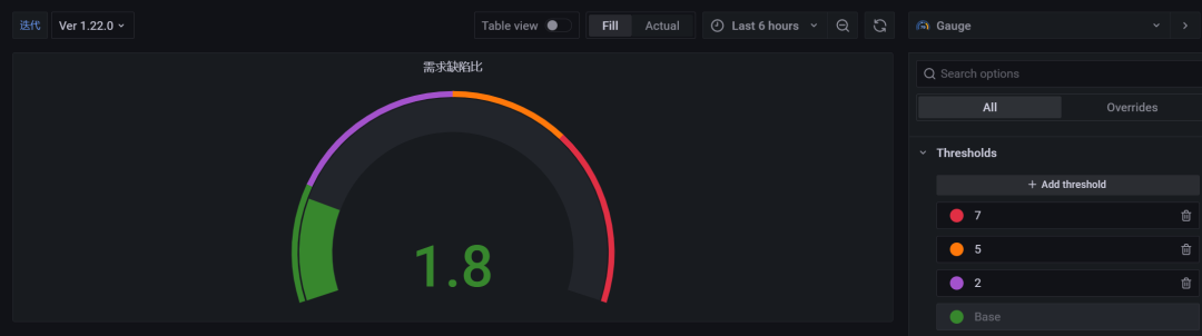 并配置了一个仪表盘Gauge,并设置指标达到不同值范围时给出不同颜色展示;