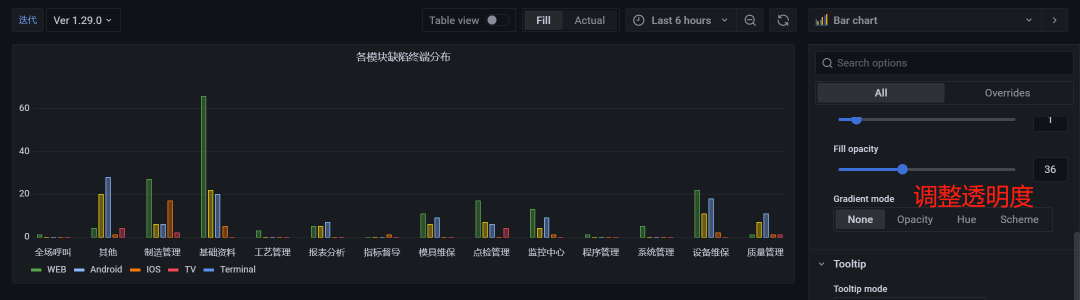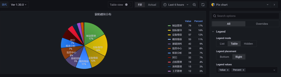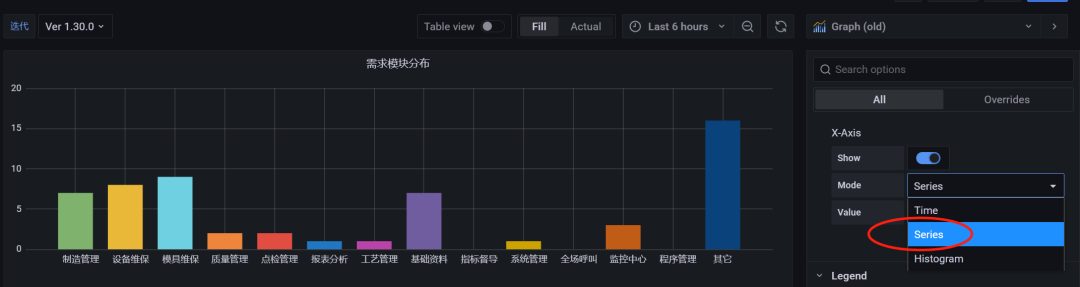 将需求所属模块进行柱状统计,图表类型Graph,注意X轴默认是时间轴需要切换成系列名。