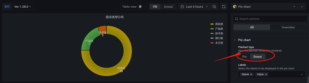 将需求分类做环形分布统计,基本跟饼图一样,设置的时候从Pie切换到Donut。
