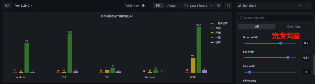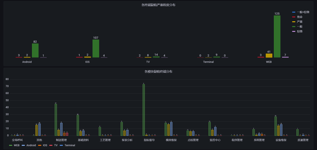 将各终端的严重程度分布和各模块的终端分布做一个柱状簇形图分布Bar Chart。(由于部分迭代中轻微和一般一起统计,部分迭代是分开统计的,故增加“一般+轻微”类别,方便历史数据显示)