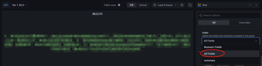 将测试总结配置STAT类型的图表展示,注意需要切换显示内容为“all fields”,因为默认是显示数字类型,不切换的话文本内容是不会展示出来的。此外还可以配置显示文本的展示字体颜色。