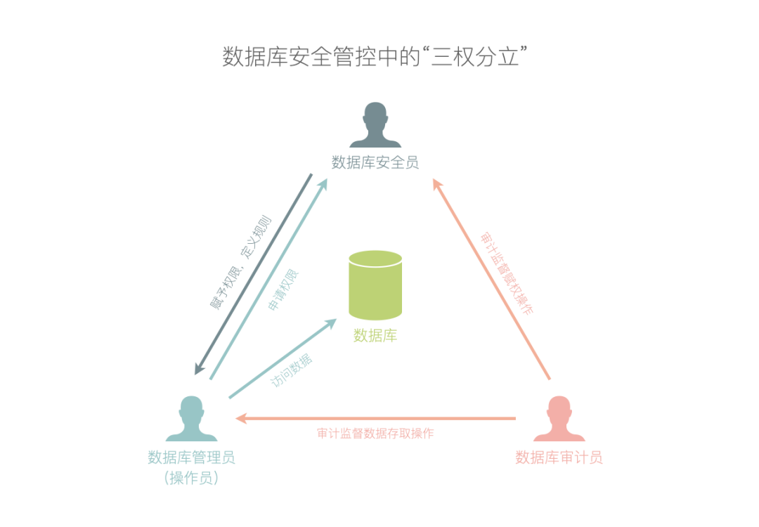 政治学中的“三权分立”想必大家都听过,即立法权、行政权和司法权三种国家权力分属不同机构所有,各自独立行使,达到相互制约制衡的目的。而在数据库的场景中,“三权分立”指的是把数据库系统的管理使用人员划分为三种不同的角色。
