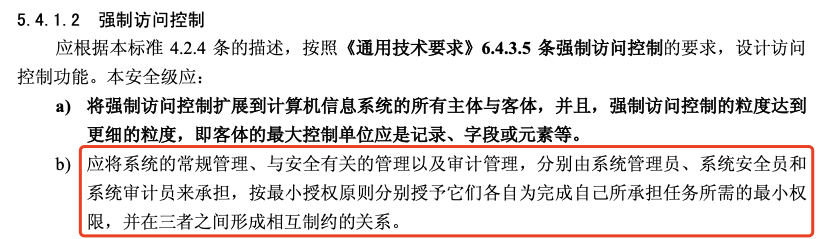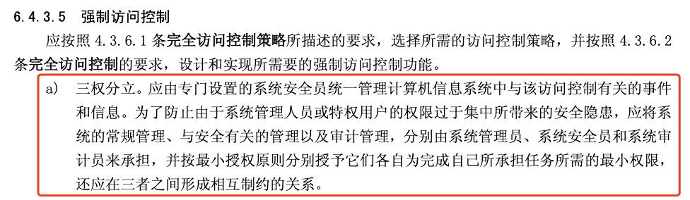根据中华人民共和国公安部发布的《计算机信息系统安全等级保护通用技术要求》以及《计算机信息系统安全等级保护数据库管理系统技术要求》中强制访问控制的相关内容,如果政企用户想要建设或改造数据库系统,使其满足3级及其以上的安全等级标准,就必须要采用“三权分立”的权限体系,如下图所示: