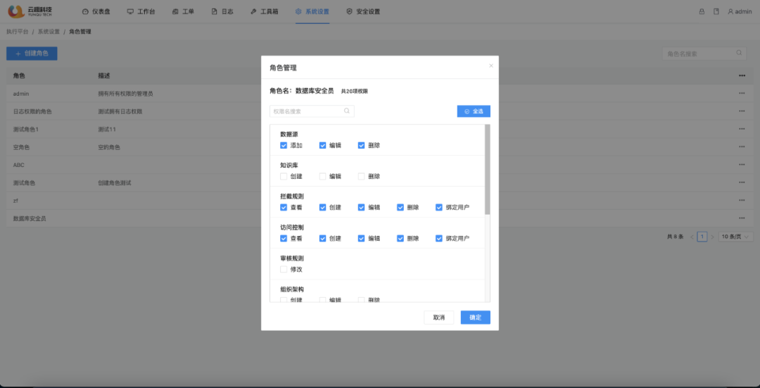 比如之前提到的“数据库安全员”的角色,其实就相当于QueryX这个平台的管理员,他需要负责数据源管理、用户管理、SQL拦截规则管理、访问控制列表管理等操作,我们可以通过【角色管理】页面来创建这个角色。注意,拥有该角色的用户,并没有访问数据源中数据的权限。但他们可以根据要求给其他用户赋予数据访问权限。