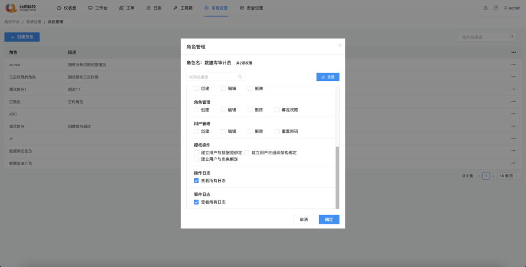 如果需要创建“数据库审计员”这个角色,只需要勾选相应的查看日志权限即可。拥有这个角色的用户除了可以查看所有的事件日志、操作日志之外,没有其他权限。