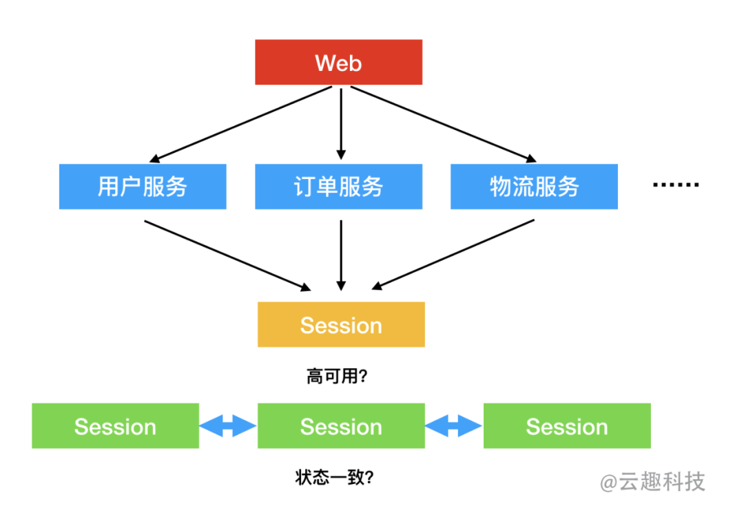 这也是该方案最为头疼的一点,也就是后端状态的共享与高可用性。在单服务器条件下所有状态存储没有任何问题。但是,一旦业务量增加,巨石型的应用大概率需要进行服务拆分,甚至使用微服务的架构进行集群化部署。在这种情况下,如果要确保各服务之间的状态一致性,就必须通过诸如 Redis 这样的公共服务来实现状态共享,但这也意味着这个服务将会非常重要,一旦 crash 将会导致整个 Web 服务不可用,所以本身需要做高可用支持(状态服务本身集群化),而集群化的场景下又会引发状态同步等一系列的问题。我们为了维持 HTTP 请求的状态引入了 Session 技术,但却使我们的整体架构变得更加复杂了。