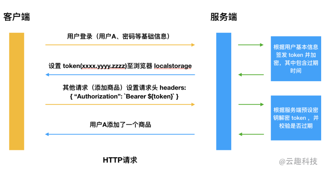 Json Web Tokens(简称JWT)方案不同于 Session ,它倡导不在服务端维持状态,只签发一个服务端所能识别的签名供给前端存储(一般使用 localstorage ),而每次 HTTP 请求的 header 中都带有该签名,服务端就能根据此字段值识别其特征。而这段被哈希过后的签名,其中包含的可以是用户的ID、名称、签名过期时间、权限等基础信息,服务端的各服务只需要使用相同的密钥解析该 Token ,就可以识别出这些信息并且确认该请求是否过期。