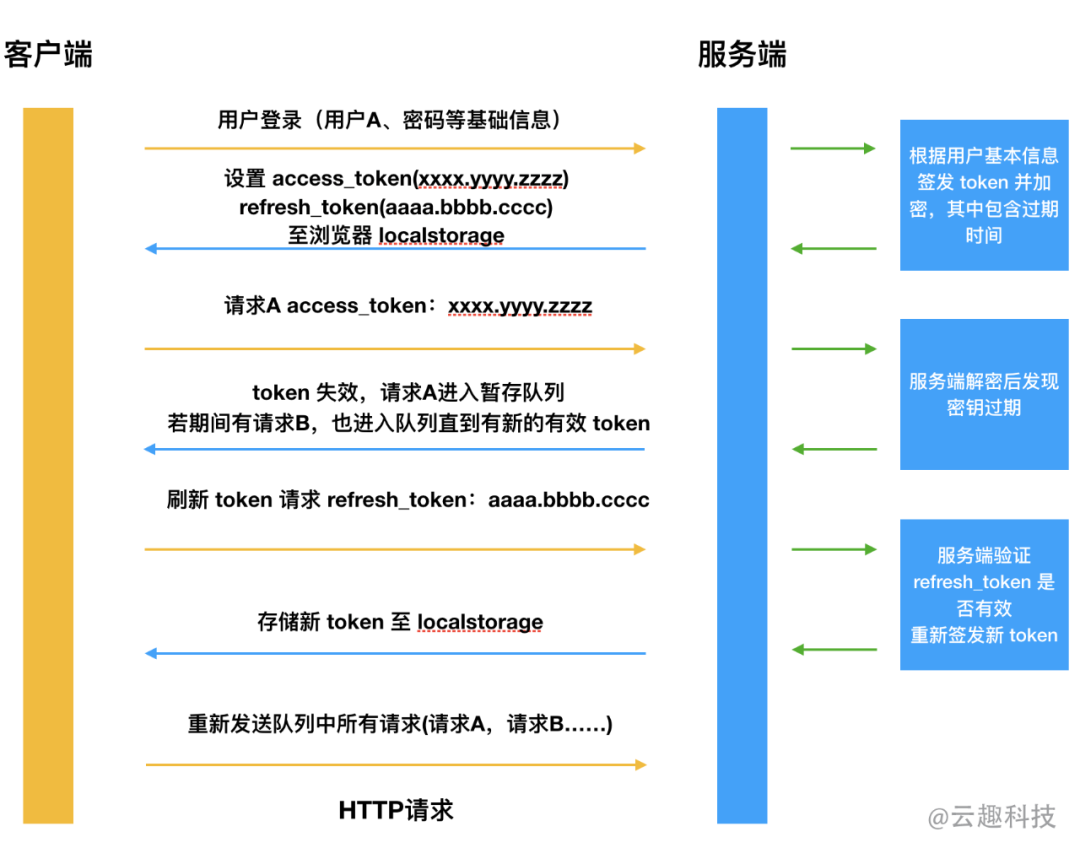 极短的有效时间虽然提升了安全性,但是牺牲了可用性。在首次签发 token 时,我们会同时签发两种 token ,一种是用于普通请求认证的 access_token ,该类 token 的特征是有效时间非常短,在该 token 过期后,请求也会无法被正常响应。这时候前端代码中需要实现一个拦截器,在检测到 access token 过期的报错后,会把该请求暂存在队列中,并使用第二类 token 也就是 refresh token(该 token 过期时间一般会比较长,)去请求重新签发最新的 token ,待请求返回后我们会存储最新的token到浏览器的缓存中,并重新发送队列中的所有请求,整个过程对于用户来说是无感的,也一定程度地保证了 token 的安全性。当然,上述操作只能让黑客的攻击成本更高,而达不到完全预防的效果。
