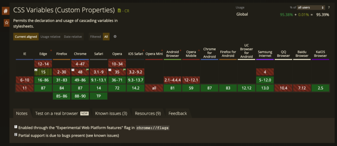 方案五则是利用css最新的variables特性来完成,其特点是css可以有一个原生的载体存放变量,且可以被js所修改,这么一听确实比较符合我们的需求,但其缺点是完全不支持IE浏览器,在Can I Use中可以查到,除了IE外,对于其他浏览器的支持都较为友好。我们本次的方案也会围绕这个技术特性开始讲解。