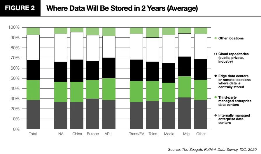 那这些高速增长的数据从哪里来,又会存放在哪里呢?根据IDC最新的调查显示,下图是未来两年企业数据存放位置的分布情况