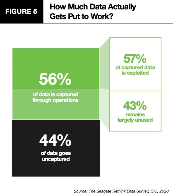 在DT(Data Technology数据处理技术)时代,我们要面对的不光是巨大的数据体量、分散的数据存放位置,还有杂乱的数据形态。静态来看,数据可以分为结构化数据(如关系型数据库中的数据),半结构化数据(日志、传感器数据、监控数据等),非结构化数据(如文档、图片、视频等);动态来看,又可以分成无界数据流(如信用卡事务数据)和有界数据流(门店订单数据)。对于有界数据流的处理,大家一定不陌生,企业中绝大部分ETL批处理流程就是用来处理这类数据的。它们有头有尾,可以等到所有数据传输完成后再进行处理。而无界数据流则不同,它有头无尾,持续生成,永远无法等到所有数据都传输完成。所以传统的批处理方式显然无法应对。这又是一个挑战。根据IDC的统计,目前企业中只有56%的数据被捕获,另外44%的数据都流逝掉了。而在这56%被捕获到的数据中,又只有57%为企业所用,这就意味着,企业实际上只利用了32%的数据,其余的68%并没有发挥价值。