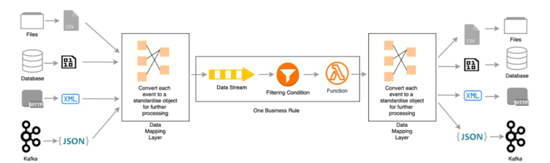 数据处理逻辑和源端、目标端解耦,通过事件将来自不同数据源的数据转换成统一的格式来存储、处理