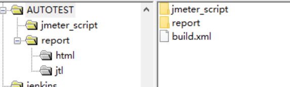 1、创建一个AUTOTEST目录,下属jmeter_script和report两个文件夹,及一个build.xml文件。report下创建两个文件夹html和jtl。把之前准备好的测试脚本放到jmeter_script文件夹下。