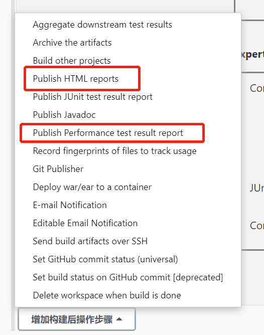 5、添加构建后步骤Publish HTML reports和Publish Performance test result report。(可能需要依赖对应插件)