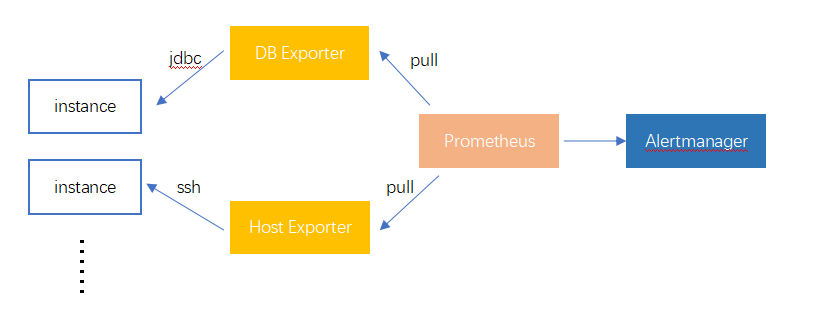 当然,这张图只是我们的一个大致的思路,从图中可以看出我们针对主机及数据库实现了两个exporter来采集他们的数据并且使用Prometheus提供的包来注册指标metrics,使用的方式是JDBC及SSH,这样的好处在于我们不需要在目标端部署agent加大实施难度,而所有的采集操作可以通过接口的RESTFUL API的方式暴露出来,至于采集的频率由Prometheus中配置的采集规则决定,只要按照配置文件中规定的采集频率来访问相应exporter中的接口并传入参数即可,这就是Prometheus中pull模式的由来,指的就是不需要采集端主动push数据且每次需要采集的数据的参数等都是由Prometheus提供,方便管理排查。
