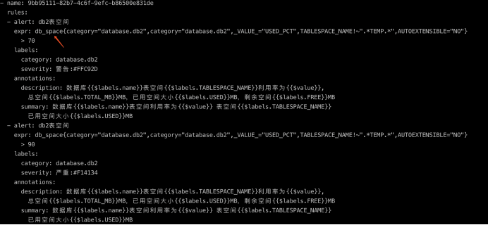如上文所说,我们已经建立了采集端与Prometheus端的监控数据联系,我们通过metrics + label的特性来确定某一具体的监控指标,这里我们可以建立一个rules.yml文件来声明各指标具体的告警规则,这里每一类的告警我们使用了一个随机的uuid去生成,在这里告警规则之下我们可以插入好几个不同阈值或不同类型的告警规则,这里我们一一讲解: