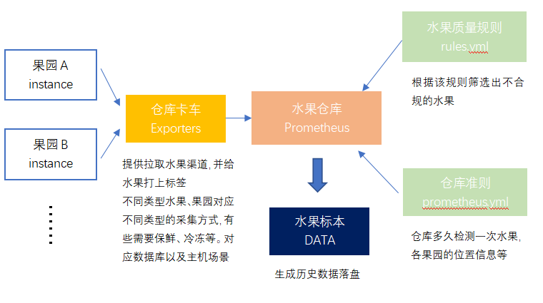 我们来打个比喻,这里我们把Prometheus比做一个水果仓库,我们需要定期检测各个果园中的水果质量,但每个果园我们都需要制定一份不同的标准,例如A果园我们一天拉取一次它的水果们,B果园我们每小时都需要拉取,这里就对应Prometheus的pull模式,每一次都是主动去拉取而不是等果园把水果运过来。这些拉取过来的水果身上都会有一个时间戳并存储进我们的水果仓库中,这时候我们需要制定一个规则判定,哪些水果烂了,我们就需要通知我们的下游,也就是销售商这个水果不能售卖了有问题,而如何判定水果烂的程度或者说怎么样才算需要告警的烂法,这里就对应rules.yml文件取声明,而我们多久检测一次所有的水果,对应的参数就是evaluation_interval,意思就是每隔十秒钟,我们就会使用rules.yml中的promql表达式针对所有实例都跑一遍,看看谁触发了告警规则。而定期我们就会对仓库中的水果做成标本,对应落盘生成历史监控数据,对应关系图如下: