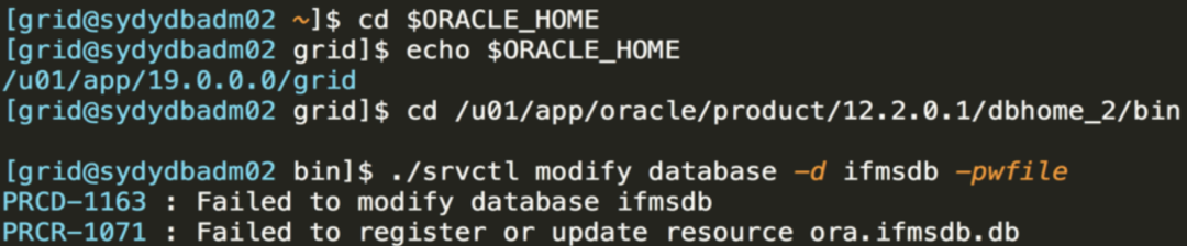 [oracle@sydydbadm02 ~]$ srvctl modify database -d ifmsdb -pwfile[oracle@sydydbadm02 ~]$ srvctl config database -d ifmsdbDatabase unique name: ifmsdbDatabase name: ifmsdbOracle home: u01/app/oracle/product/12.2.0.1/dbhome_2Oracle user: oracleSpfile: +DATAC1/IFMSDB/PARAMETERFILE/spfile.42385.1029920135Password file:Domain:Start options: openStop options: immediateDatabase role: PRIMARYManagement policy: AUTOMATICServer pools:Disk Groups: RECOC1,DATAC1Mount point paths:Services:Type: RACStart concurrency:Stop concurrency:OSDBA group: dbaOSOPER group: racoperDatabase instances: ifmsdb1,ifmsdb2Configured nodes: sydydbadm01,sydydbadm02CSS critical: noCPU count: 0Memory target: 0Maximum memory: 0Default network number for database services:Database is administrator managed
