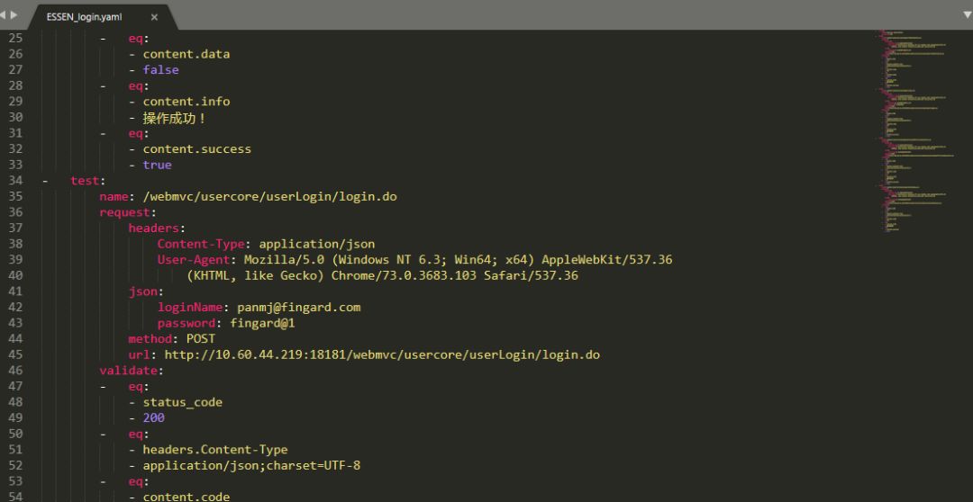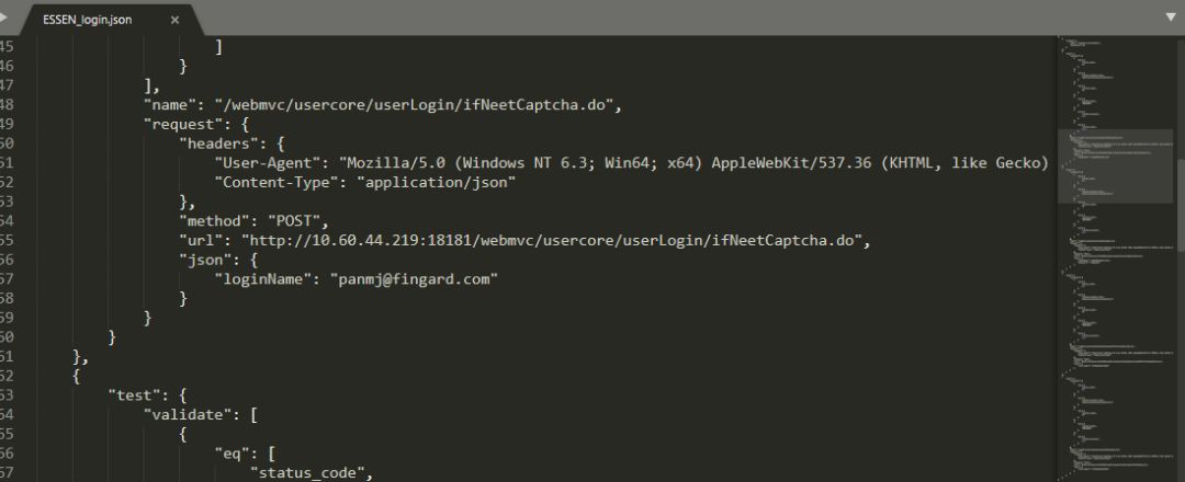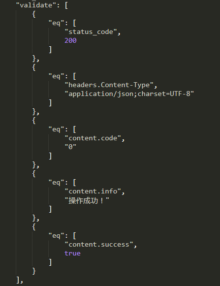 har2case转换后的json文件自动生成了validate部分的内容,包含了http状态码,各json节点等等断言。通用接口几乎不需要另外再修改,除了特殊的一些请求需要自己加点校验项进去。