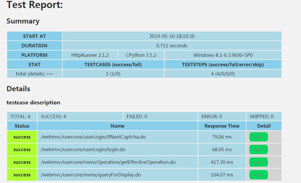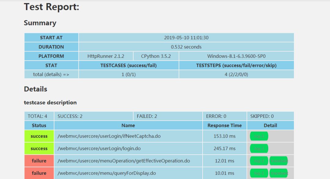 这个报告只有一个html文件,界面看着也舒服,还可以看每个接口的请求响应信息以及失败 报错日志。