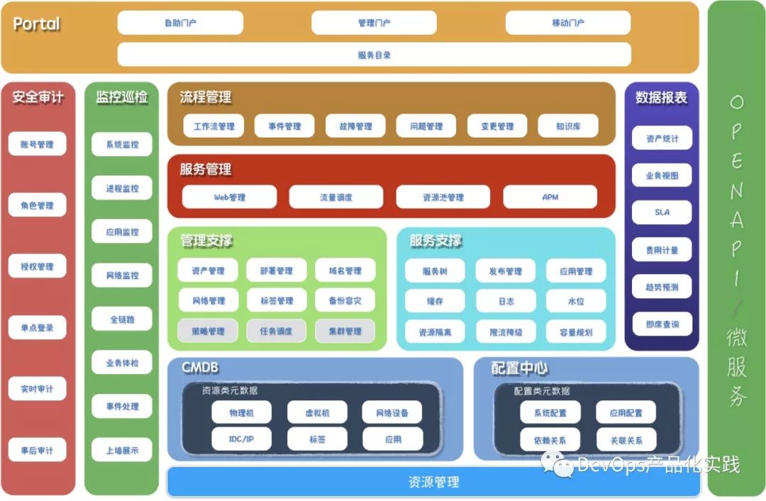 建设 DevOps 平台伊始,先规划设计了平台的整体架构和功能模块,因为运维系统非常庞杂、繁复,如果事先没有全局性的规划,很容易掉入“竖井”陷阱。所以通过前期的架构设计,实现“横向整合”,为后期“模块复用”、“按需定制”打下基础。