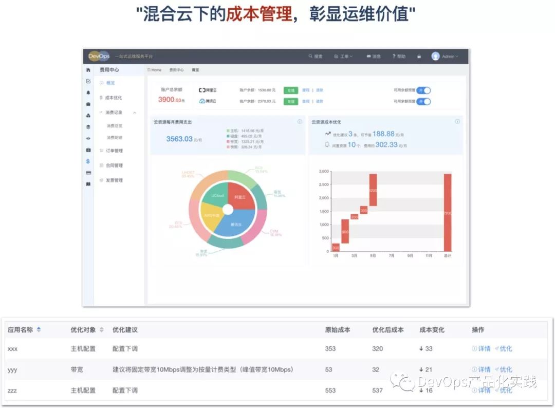 关于费用中心,这个是在实践过程中临时加入的模块,在公有云、混合云大势所趋的形式下,怎样统一管理是我们不得不面对的问题。与此同时,在资源价格透明化的背景下,合理利用资源实现成本优化和管理,是彰显运维价值的一大途径——省了就是挣了,运维也能为公司挣钱了!