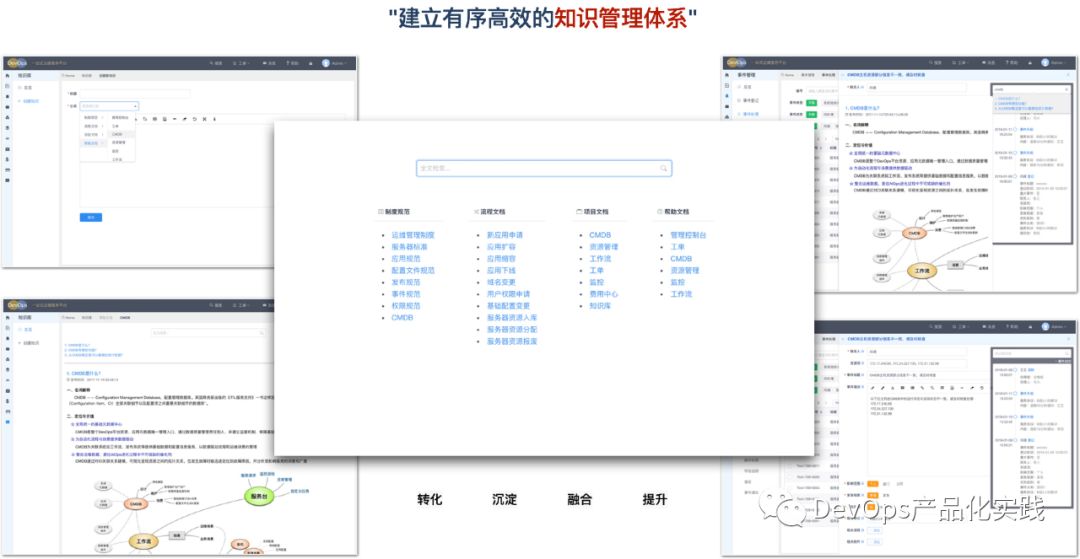 最后,平台不能仅仅提供功能和解决方案,也要将运维能力转化为知识、沉淀经验,并把知识融合到各功能和环节中,提升运维服务质量和效率。