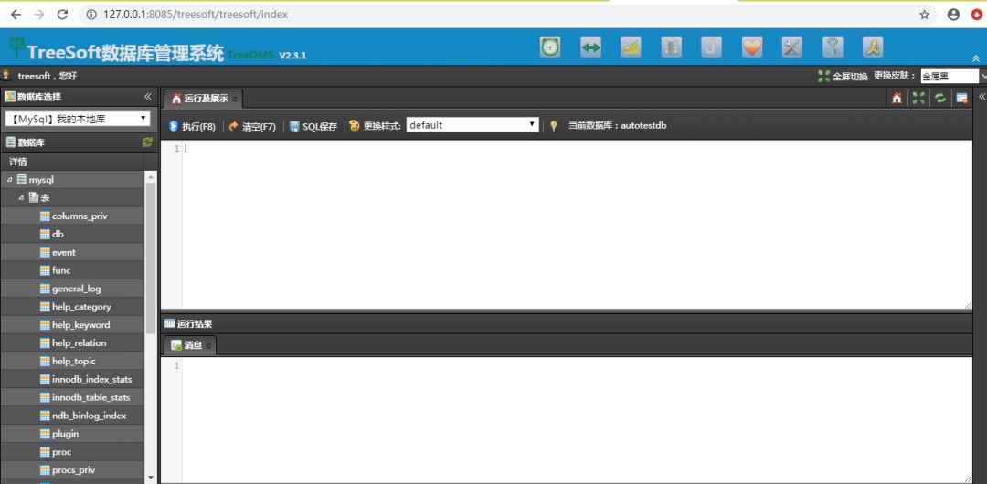 在官网下载TreeDMS for MySQL,Oracle,PostgreSQL, SQL Server, MongoDB, Hive,解压后直接双击bin/startup.bat即可启动系统,访问地址默认配置为http://127.0.0.1:8085/treesoft/,默认登录用户名密码都是treesoft。