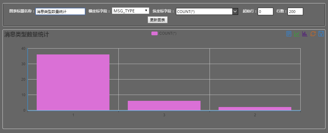 将查询结果以图表形式展示,举例,将消息表中的消息数量按不同消息类型以图表形式展示。先运行sql——select t.MSG_TYPE,t.count(*) from TABLE group by MSG_TYPE,然后在结果展示栏点击图表按钮,进入图表设计页面。