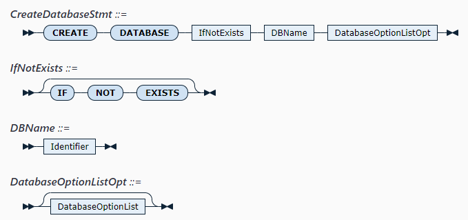 本示例中,CreateDatabaseStmt、IfNotExists、DBName、DatabaseOptionListOpt都表示语法块。同时由于CreateDatabaseStmt语法图过长,分别将其中的IfNotExists、DBName和DatabaseOptionListOpt语法单元生成独立的语法图。