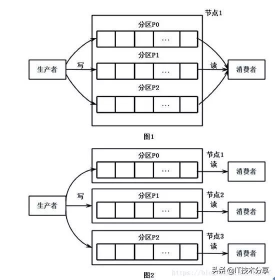 分区是消费者现场模型的最小并行单位。如下图(图1)所示,生产者发布消息到一台服务器的3个分区时,只有一个消费者消费所有的3个分区。在下图(图2)中,3个分区分布在3台服务器上,同时有3个消费者分别消费不同的分区。假设每个服务器的吞吐量时300MB,在下图(图1)中分摊到每个分区只有100MB,而在下图(图2)中,集群整体的吞吐量有900MB。可以看到,增加服务器节点会提升集群的性能,增加消费者数量会提升处理性能。