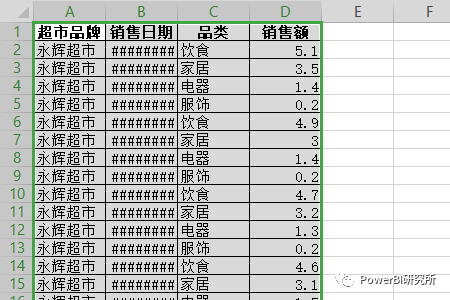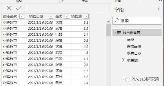 第四步:在表格中就会超市销售表的数据,此时就已经从power bi文件中下载了源数据。
