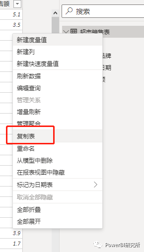 第一步:打开PBIX文件,点击数据视图,选中超市销售表,点击鼠标右键,有个复制表的功能,点击复制表,如图: