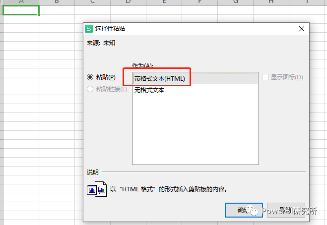 第三步:在选择性粘贴编辑框中,选择带格式文本(HTML)选项,点击确定,如图: