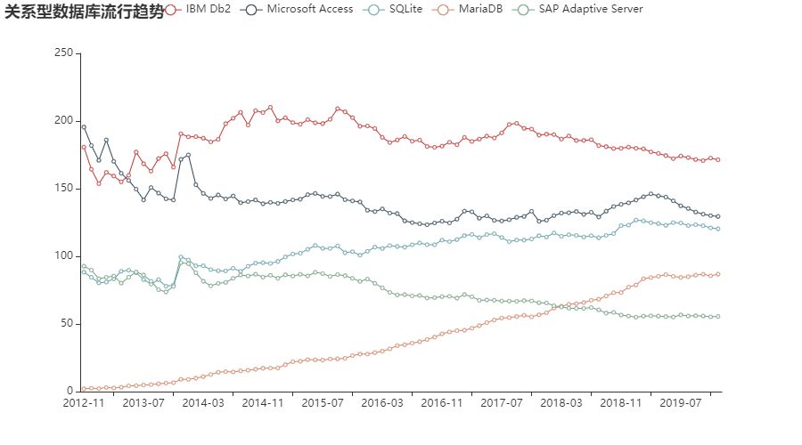 可以看出,IBM 的 DB2 和微软的 Access 近年都有下滑的趋势,而作为 MySQL 的开源版 MariaDB,则呈现了很强的上升趋势,看来大家拥抱开源的信念不减呢!