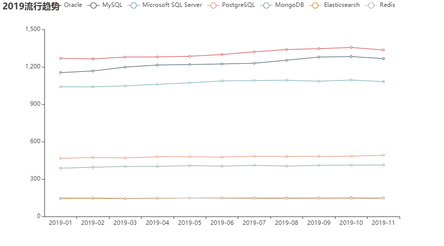 可以看到它们在 2019 年总体表现还是比较平稳的,其中榜首三强都是在年末出现了不同程度的下滑,而与之对应的则是 PG 数据库的增长了。