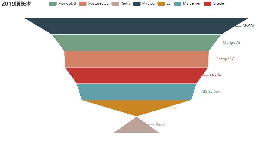 可以看到 MySQL 是增长率最高的数据库,而 Redis 在 2019 年则表现不佳,呈现了负增长的趋势。