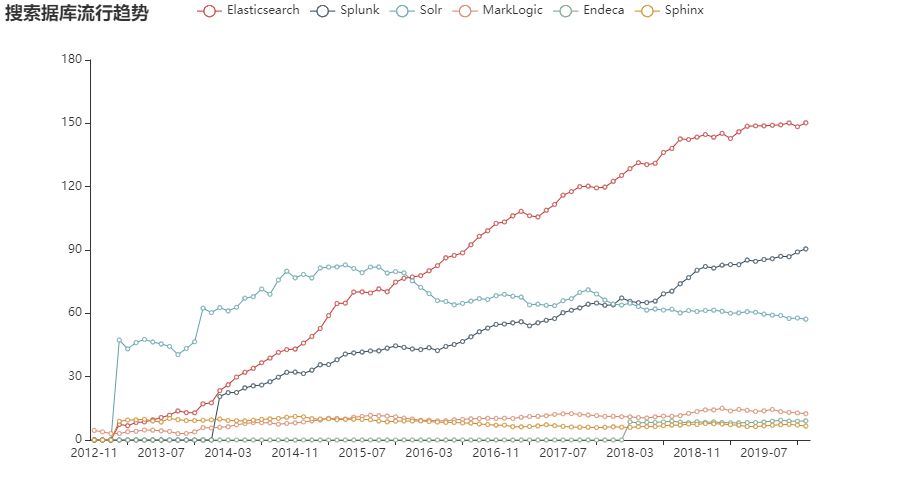 从历年走势中看出,Solr 有些扎心了,随着 ES 和 Splunk 的强势崛起,Solr 似乎慢慢归于平静了。