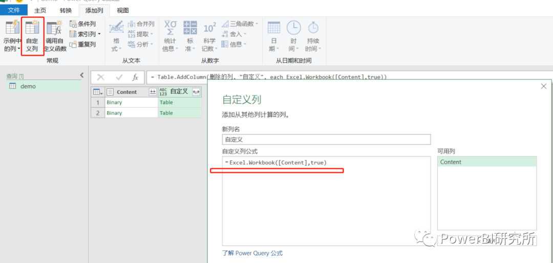 =Excel.Workbook([Content],true)粘贴到公式编辑框中,如图: