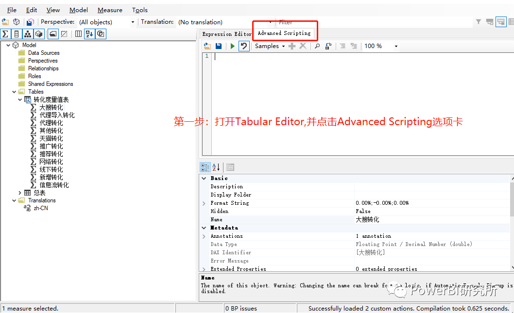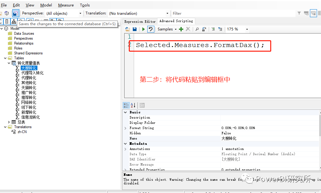 第一步:从外部工具打开Tabular Editor ,再点击Advance Scripting选项卡,如图第一步: