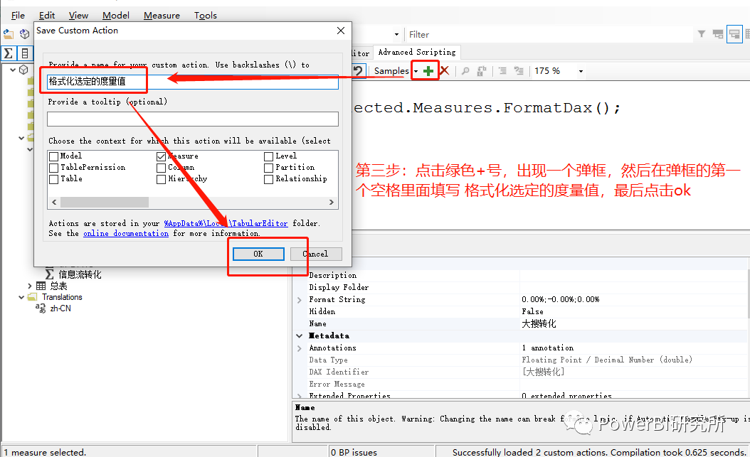 第三步:点击绿色+号,出现一个弹框,在第一空格里面填写 格式化选定的度量值,然后点击ok ,如图第三步: