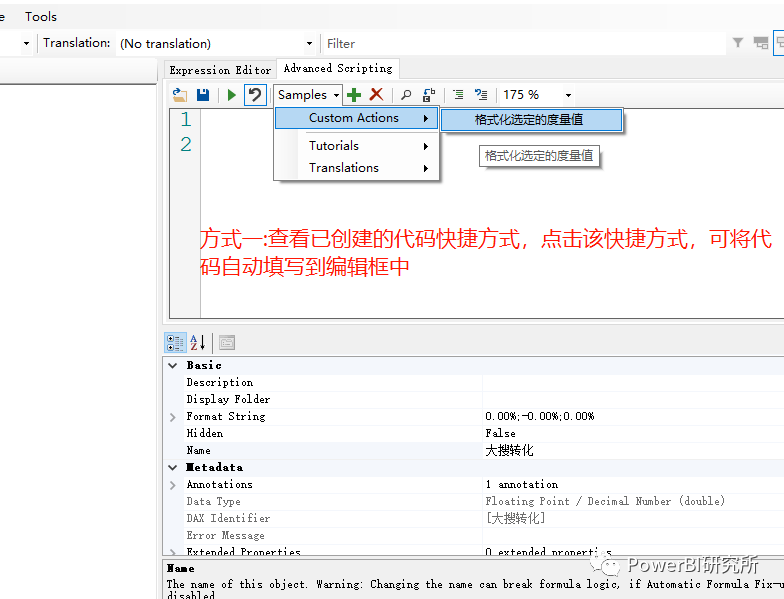 第四步:查看创建的快捷方式:方式一:点击Samples,再点击 Custom Actions,即可看到创建的格式化选定的度量值快捷方式,点击该快捷方式,可将代码自动填写到编辑框中,如图方式一:
