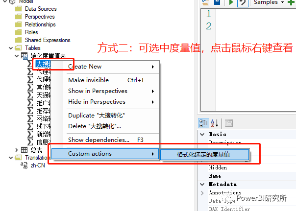 方式二:选定某个度量值,右键->Custom Actions->创建的代码快捷方式,如图方式二: