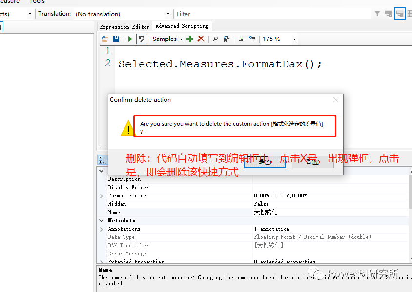 删除创建的代码快捷方式,步骤如下:以删除格式化选定的度量值代码为例, 第一步:点击Samples,再点击 Custom Actions,然后点击要删除的快捷方式,此时代码已自动填充到编辑框 第二步:点击Advance Scripting选项卡下方的X号,会出现一个弹框,是否要删除格式化选定的度量值,再点击是,即会自动删除该快捷方式,如图: