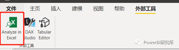 第一步:通过外部工具Analyze In Excel新建一个能连接该PowerBI文件的EXCLEL工作簿,如图:点击外部工具,点击Analyze In Excel,