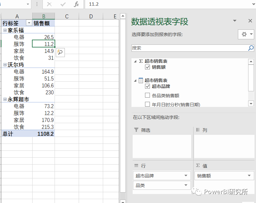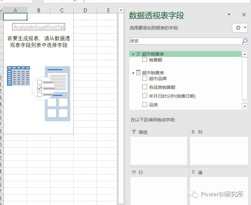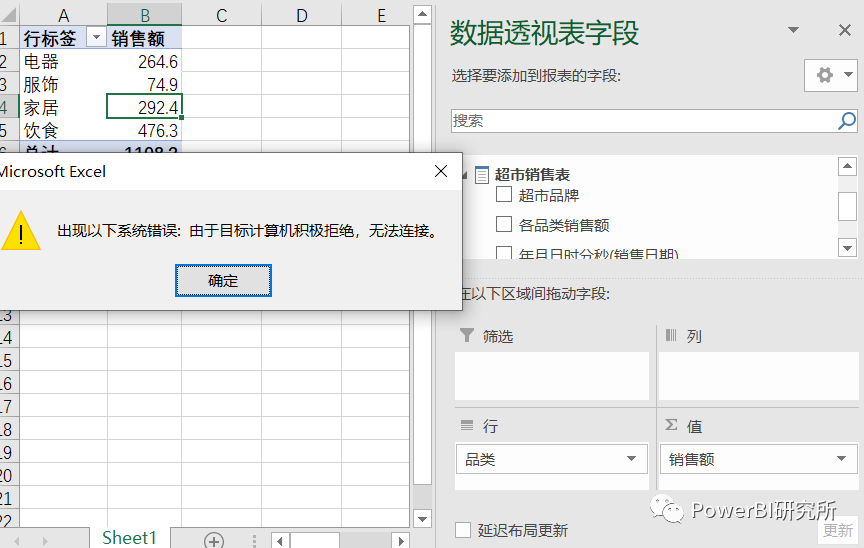 第四步:重新打开power bi文件,此时再次操作test工作簿,将超市品牌拖放到行区域,会出现如下提示: