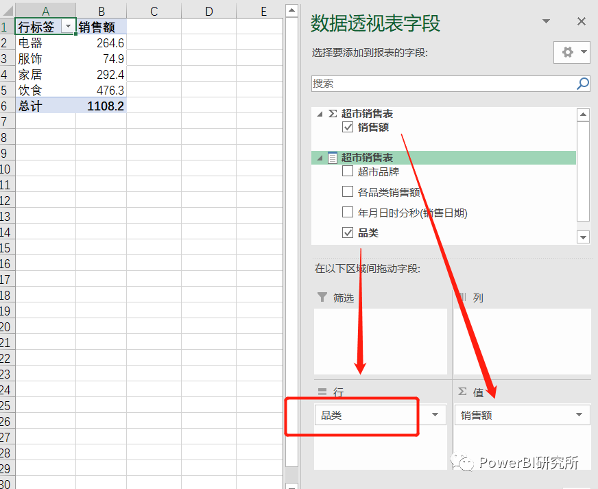 可以将品类字段拖放在行上,销售额拖放在值区域,如图;