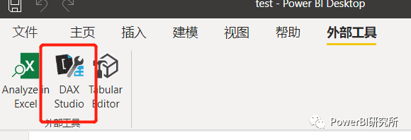 第一步:在power bi外部工具栏点击DAX Studio,如图: